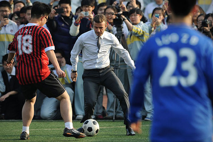 From March 20 to 24, Beckham had a tight schedule in Beijing, Qingdao and Wuhan by visiting local schools and football clubs including Beijing Guo'an Football Club at Workers Stadium, Qingdao Jonoon Football Club as well as Wuhan Zall Football Club. In each city, Beckham met the Chinese footballers, fans and had a kick-around with youngsters. The 37-year-old even tried to demonstrate the perfect free-kick skill in a suit and shoes, but fell flat on his backside.