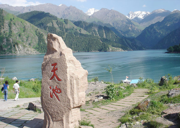 Bogda Peak, one of the snowy peaks within the tianshan mountain range, is covered with snow all the year round and thus nicknamed "the sea of snow". On the mountainside of Bogda Peak, there's a lake called "Tianchi" (meaning "heavenly lake"). It is 1,900 meters above sea level and as deep as 90 meters. The crystal-clear lake water is made up of melted ice and snow. The lake is like a big mirror reflecting the snow-white peak and emerald-green spruce trees. The picturesque spot is a famous tourist attraction.
