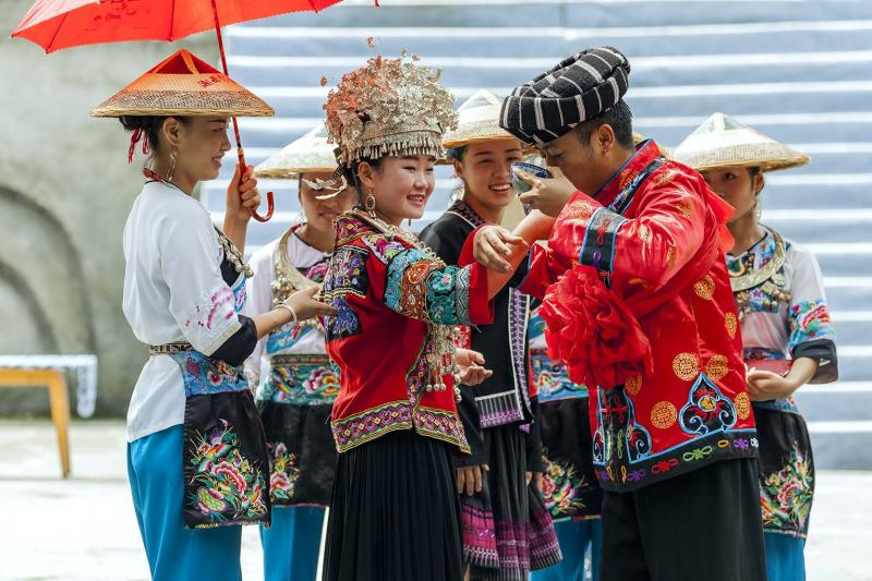 Women here like to wear silver jewelry and collarless embroidered clothes; men like to tie leggings. They raise silkworms, weave cloth, and sometimes make clothes on their own. People here use ancient methods to extract cooking oil, make paper, mill rice, and use water wheels to lift water to fill the fields.