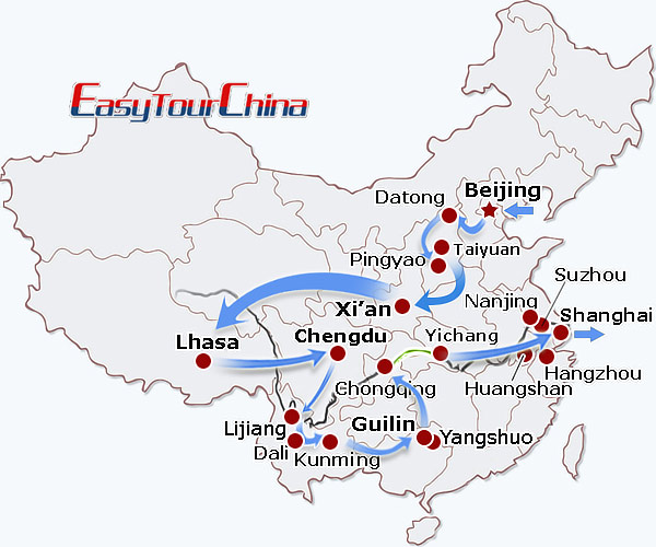Destinations: Beijing - Datong - Pingyao - Taiyuan - Xi'an - Lhasa - Chengdu - Lijiang - Dali - Kunming - Guilin - Yangshuo - Guilin - Chongqing - Yangtze Cruise - Yichang - Shanghai - Huangshan - Hangzhou - Nanjing - Suzhou - Shanghai